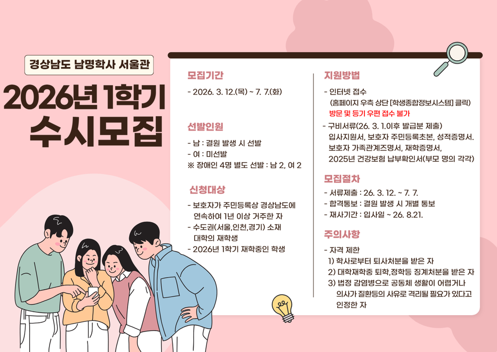 [남명학사 창원관·서울관] 2026년 1학기 수시모집 공고입니다.