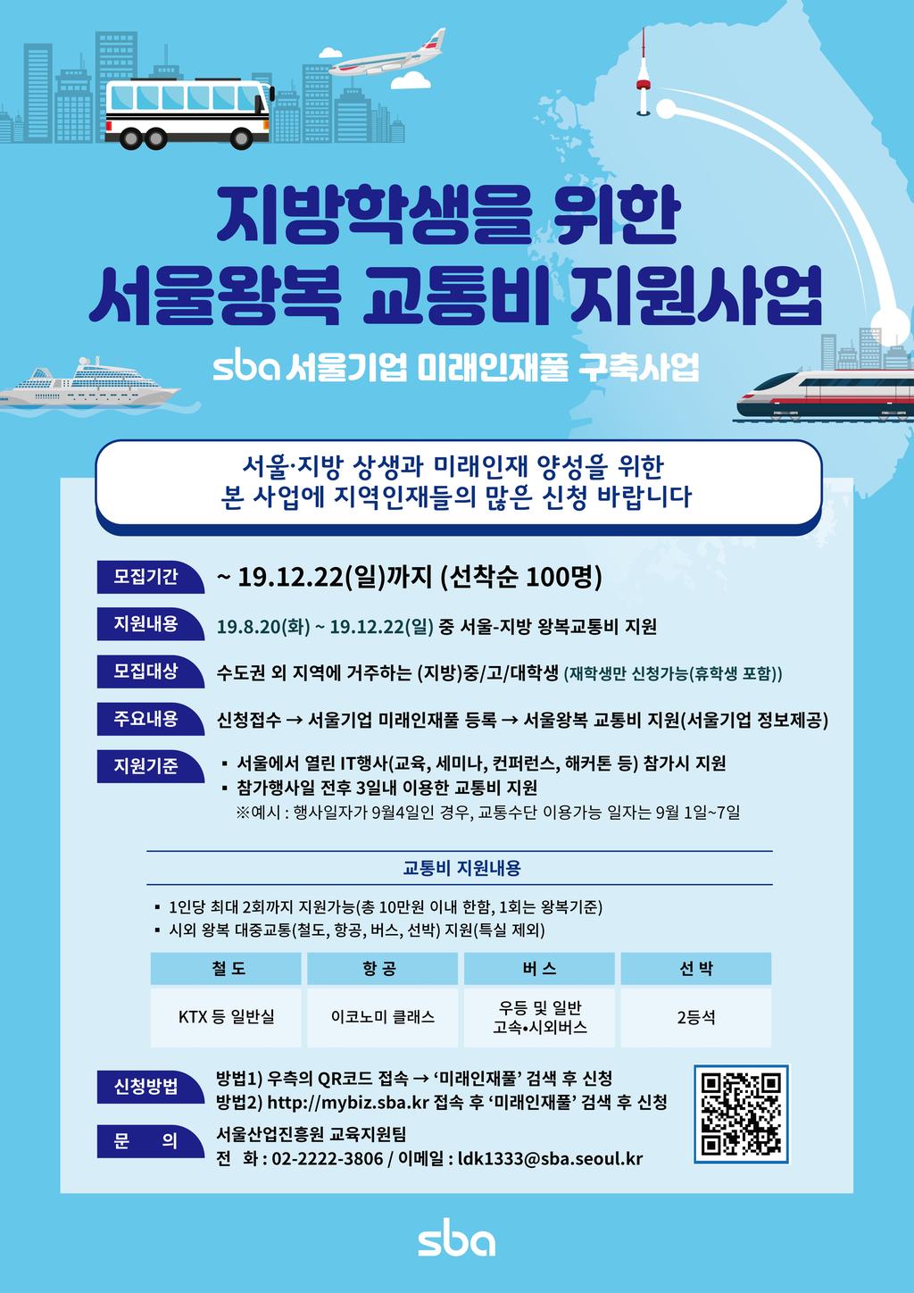 - 지원내용: 2019.8.20.(화)~19.12.22.(일) 중 서울,지방 왕복교통비 지원