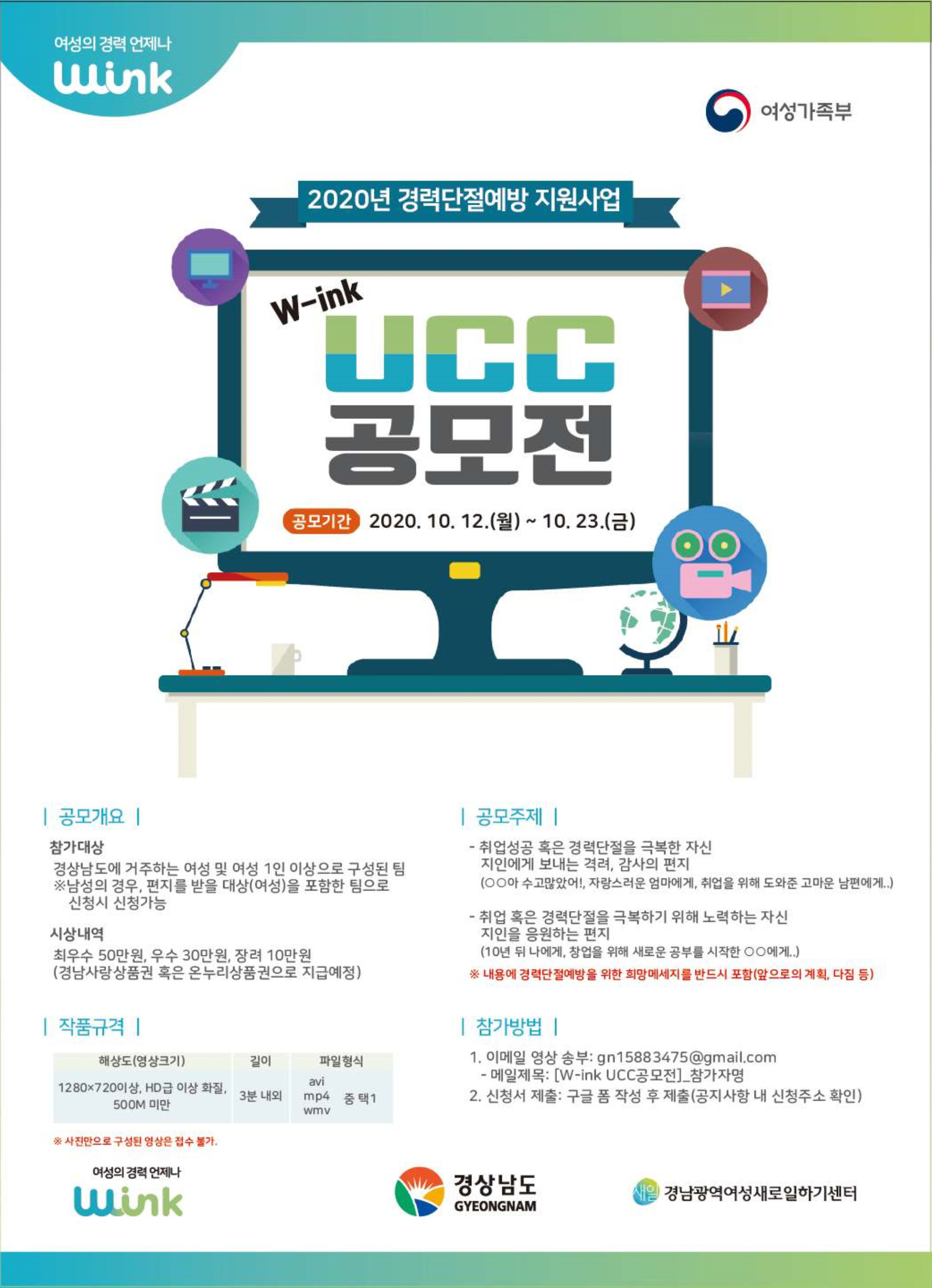 여성들의 경력단절예방 인지도 확산을 위해 경남지역에 거주하는 여성을 대상으로 『2020년 W-ink UCC공모전』을 다음과 같이 공고하오니 해당 공모전에 참여하고자 하는 분들은 신청하여 주시기 바랍니다.