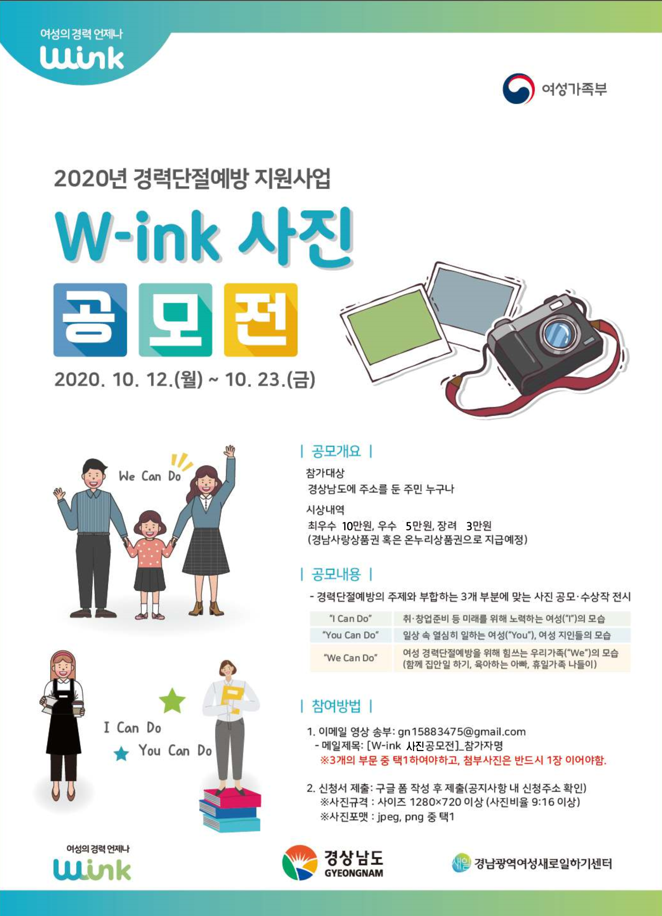일상생활 속 경력단절예방의 사례를 찾아보고 여성 경력단절예방에 대한 의미를 생각해보는 『2020년 W-ink 사진공모전』을 다음과 같이 공고하오니 관심 있는 분들의 많은 참여를 바랍니다.