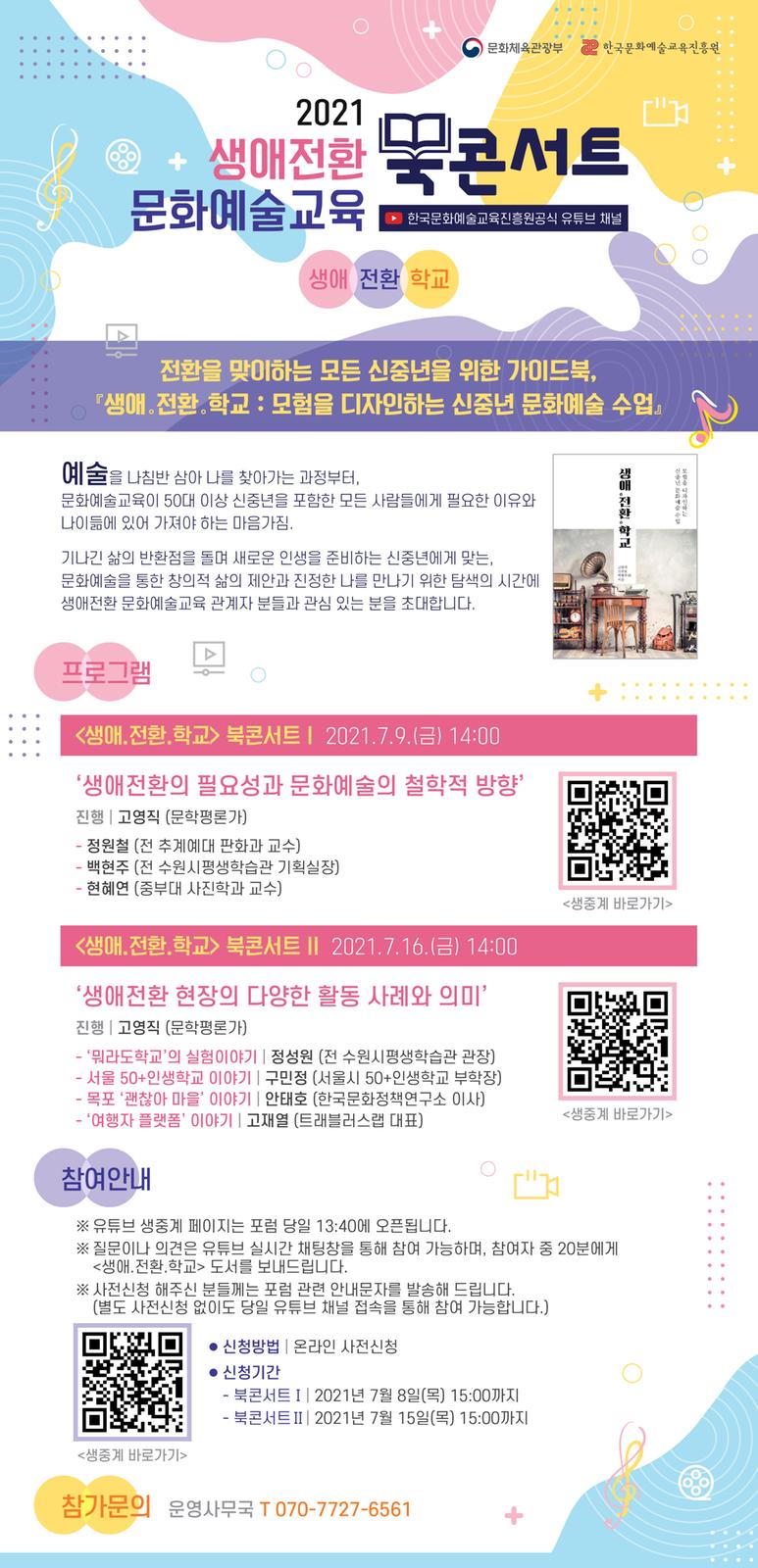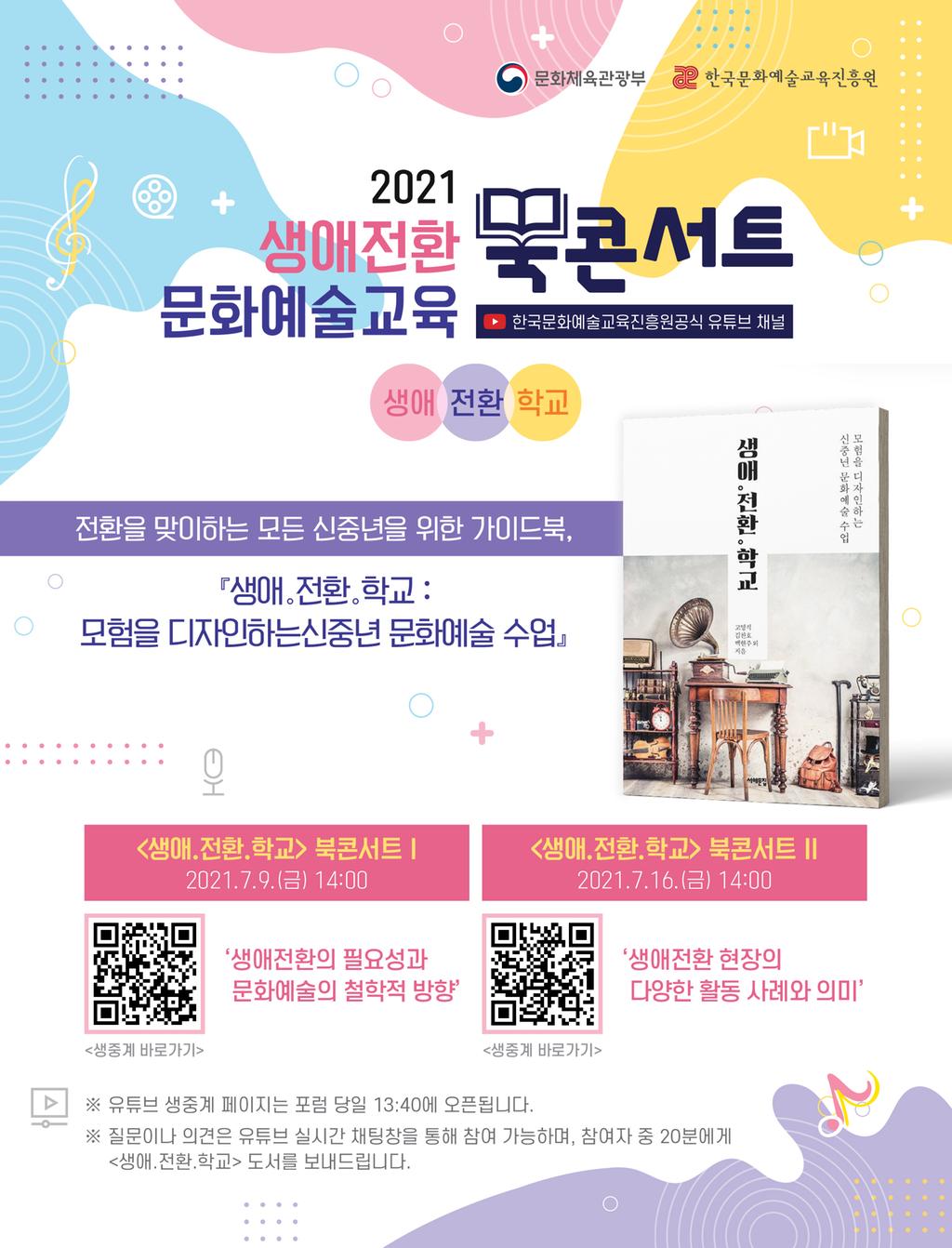 한국문화예술교육진흥원에서 2021「생애.전환.학교」북 콘서트를 진행하오니 신중년 분들의 많은 참여 바랍니다.