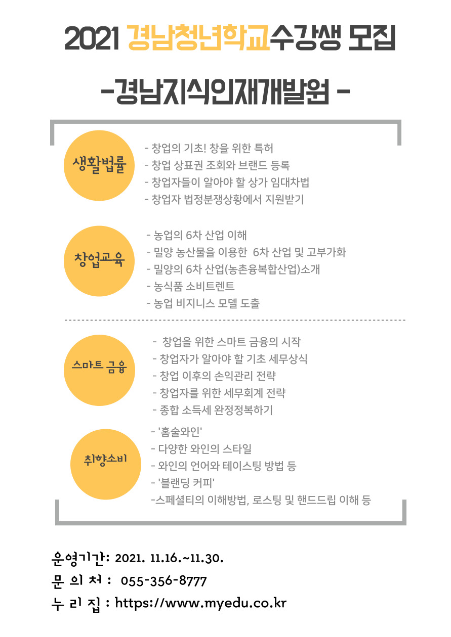 경남지식인재개발원 (055-356-8777) | 2021.11.16.~11.30. | http://www.myedu.co.kr |