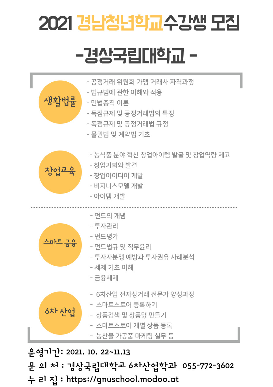 일반교육 (총 4개 강좌,80시간) | 경상국립대학교 6차산업학과 (055-772-3602) | 2021.10.22.~11.13. | https://gnuschool.modoo.at |
