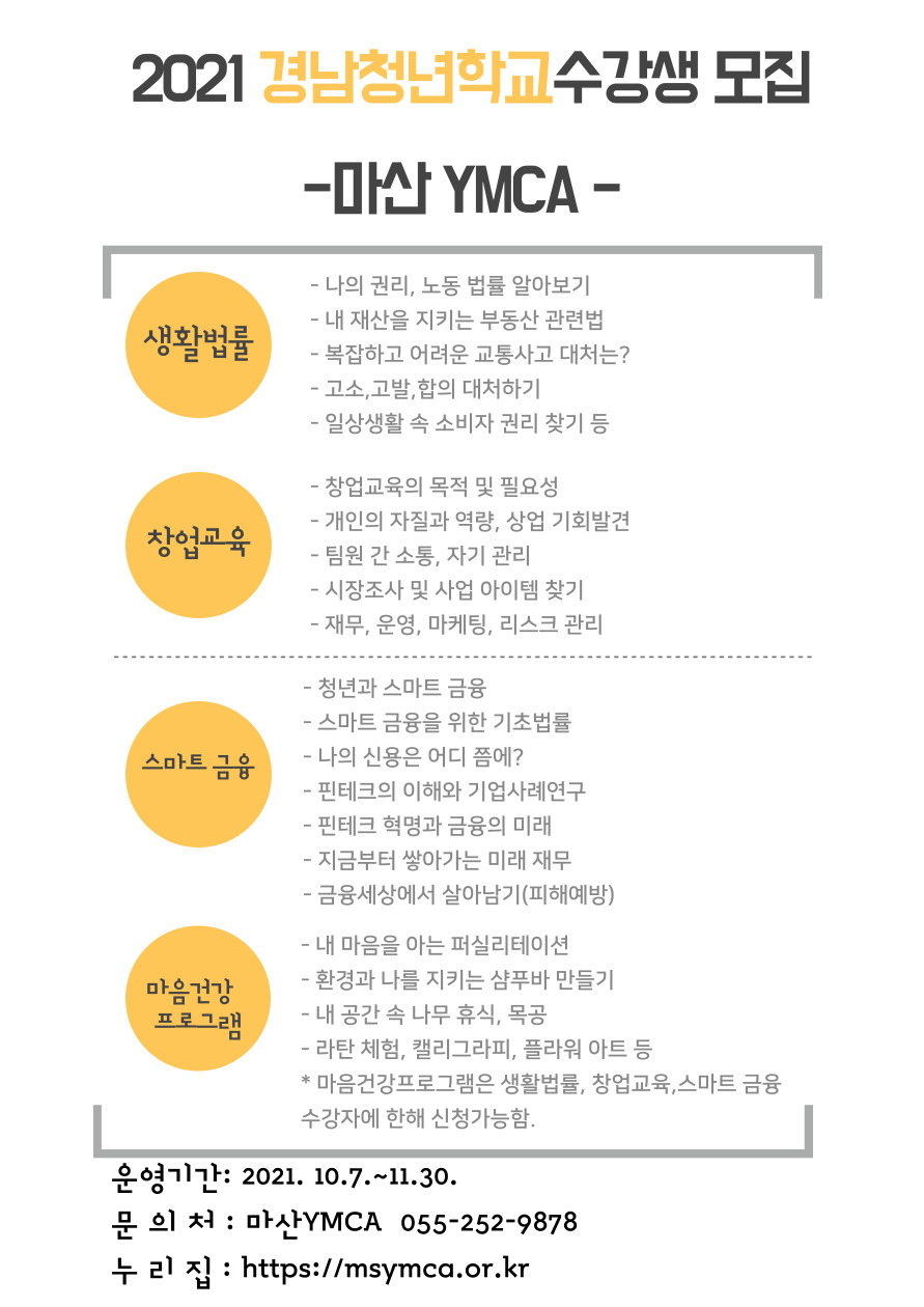마산YMCA (055-252-9878) | 2021.10.7.~11.30. | http://www.msymca.or.kr | |