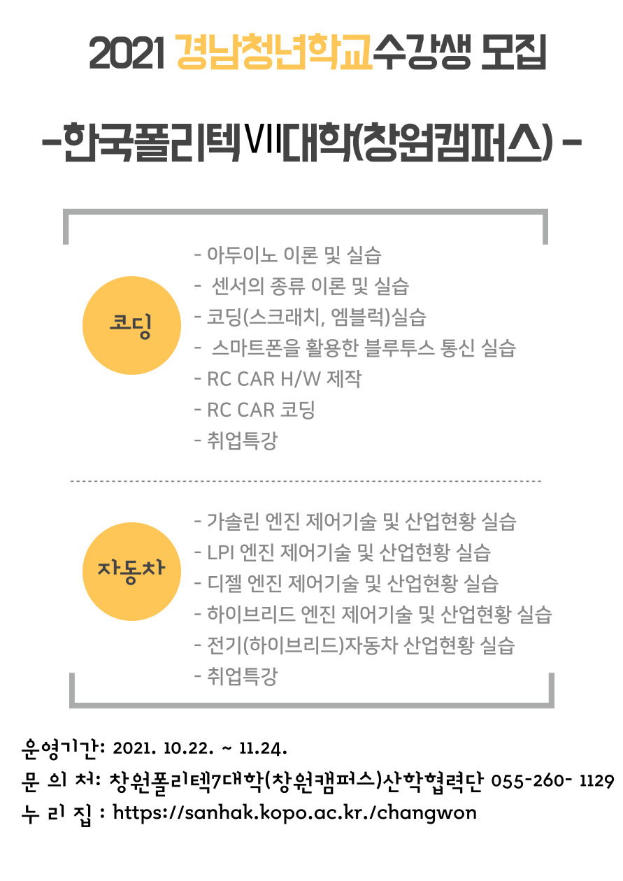 기술교육 (총 2개 강좌,40시간) | 한국폴리텍Ⅶ대학(창원캠퍼스) 산학협력단 (055-260-1129) | 2021.10.22.~11.24. | https://sanhak.kopo.ac.kr/ changwon |