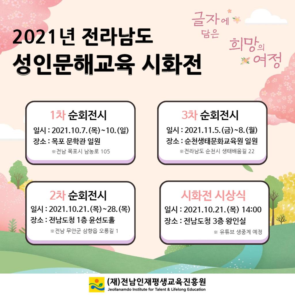 성인문해교육의 필요성과 중요성에 대한 사회적 인식을 높이기 위해 2021년 전라남도 성인문해교육 시화전을 개최합니다. 문해학습자들의 학습성과인 시화 작품에 대하여 많은 관심과 참여 바랍니다.