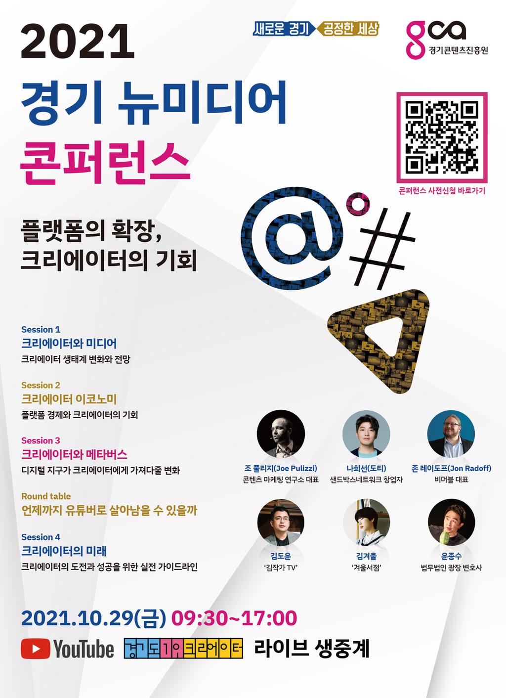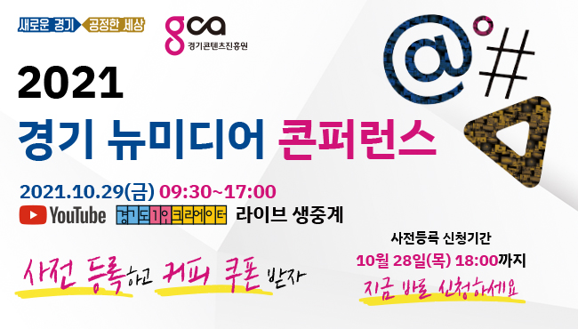 경기도가 주최하고 경기콘텐츠진흥원이 주관하는 ‘경기 뉴미디어 콘퍼런스’가 2021년 10월 29일(금) 1일간 온라인에서 진행됩니다. 관심있는 분들의 많은 참여 바랍니다.