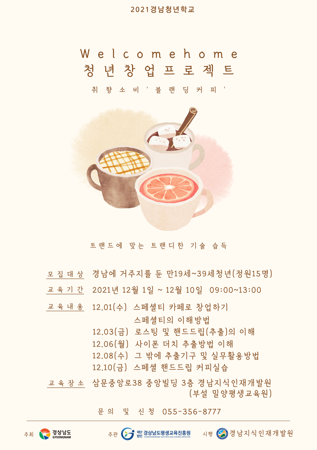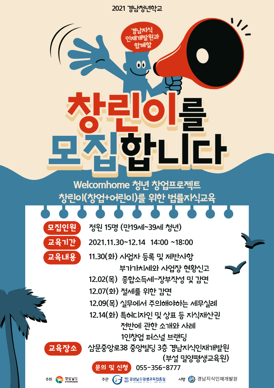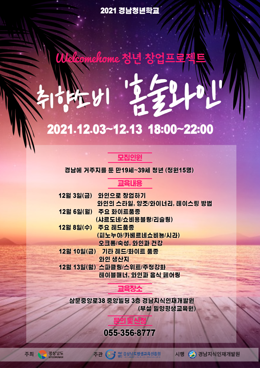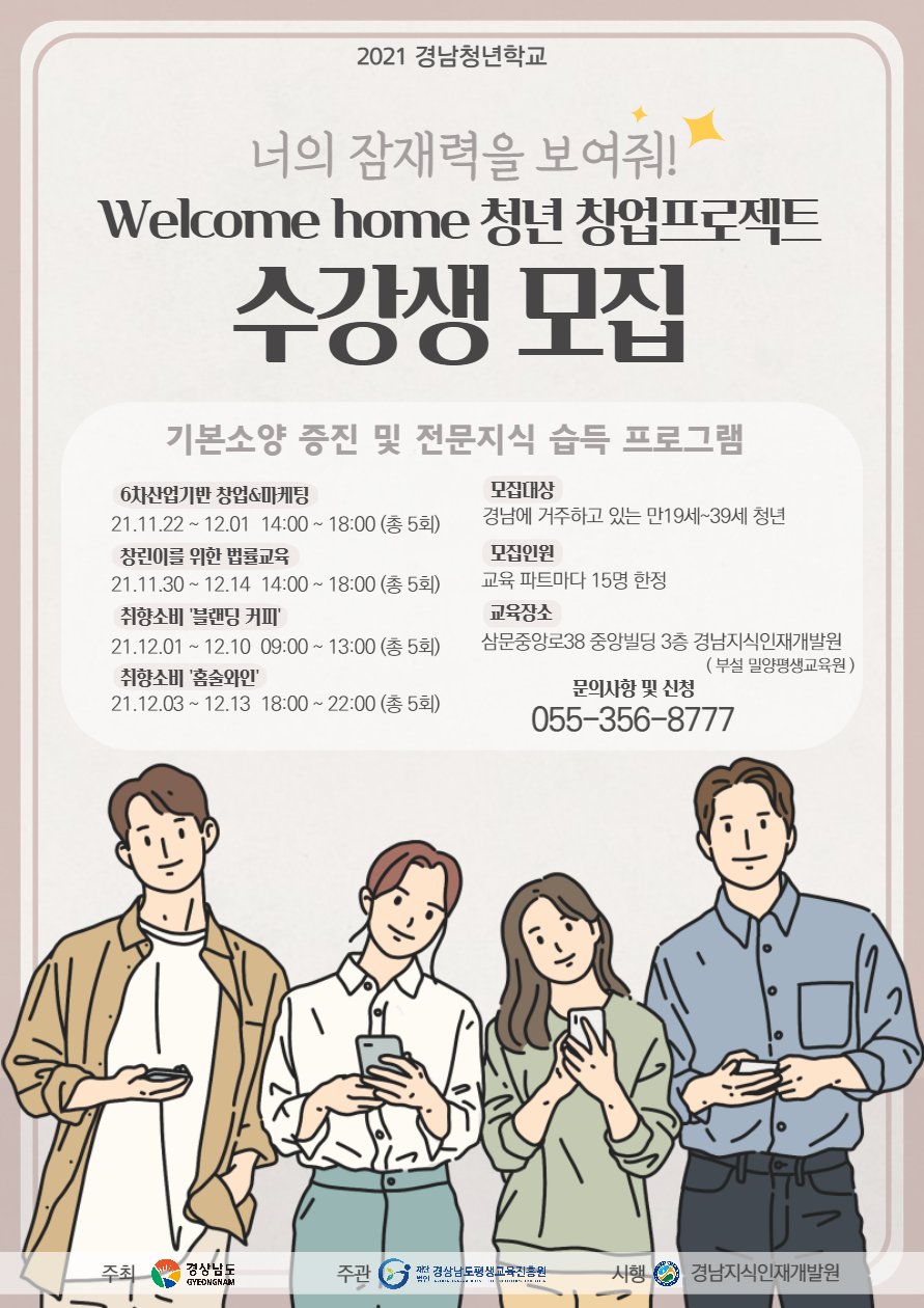 '2021 경남청년학교 '의 일환으로 진행되는 "Welcome home 청년 창업 프로젝트" 무료교육생을 모집합니다.