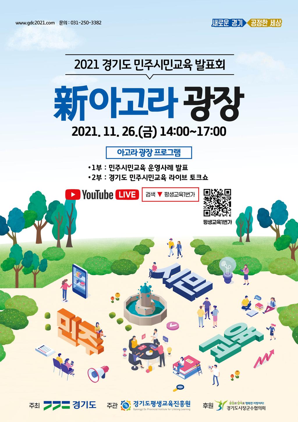 경기도와 경기도평생교육진흥원에서 경기도 민주시민교육 운영사업 공유를 위한 「2021년 경기도 민주시민교육 발표회, 新아고라 광장」을 개최합니다. 비대면 생중계로 진행되는 본 행사에 많은 관심 바랍니다.