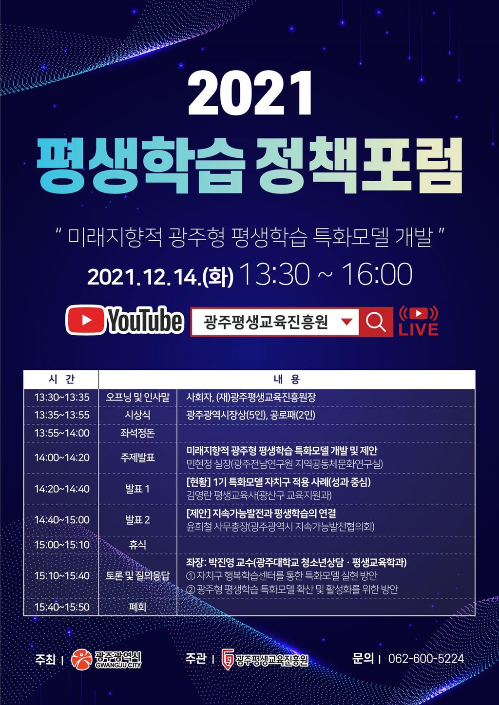 광주평생교육진흥원에서 평생학습을 통한 정의롭고 풍요로운 광주 건설을 위해 <미래지향적 광주형 평생학습 특화모델 개발>을 주제로 「2021년 평생학습 정책포럼」을 개최하오니, 관심 있는 분들의 많은 참여 바랍니다.