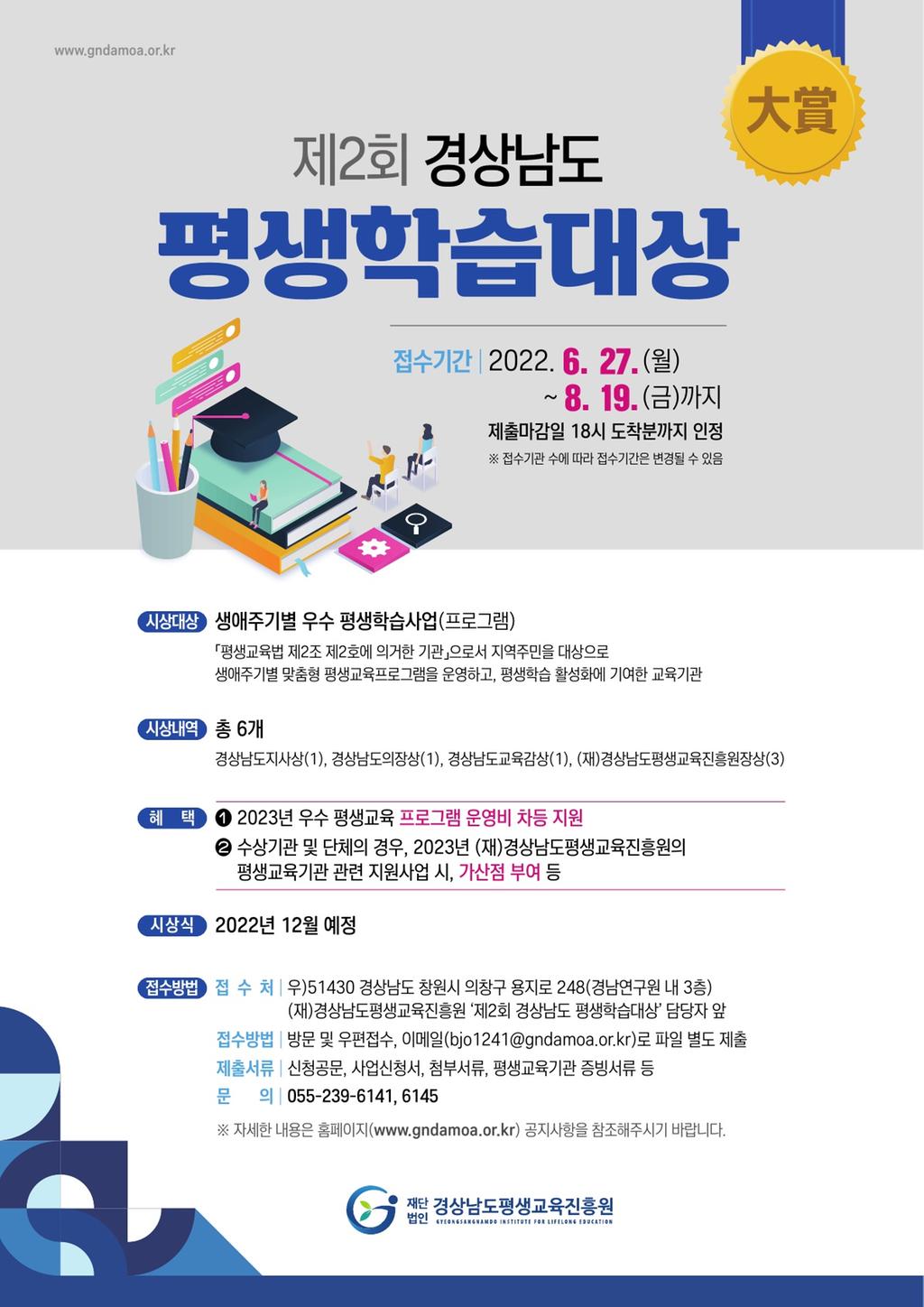 확산시키고자 제2회 경상남도 평생학습대상을 공모하오니 많은 관심 부탁드립니다.