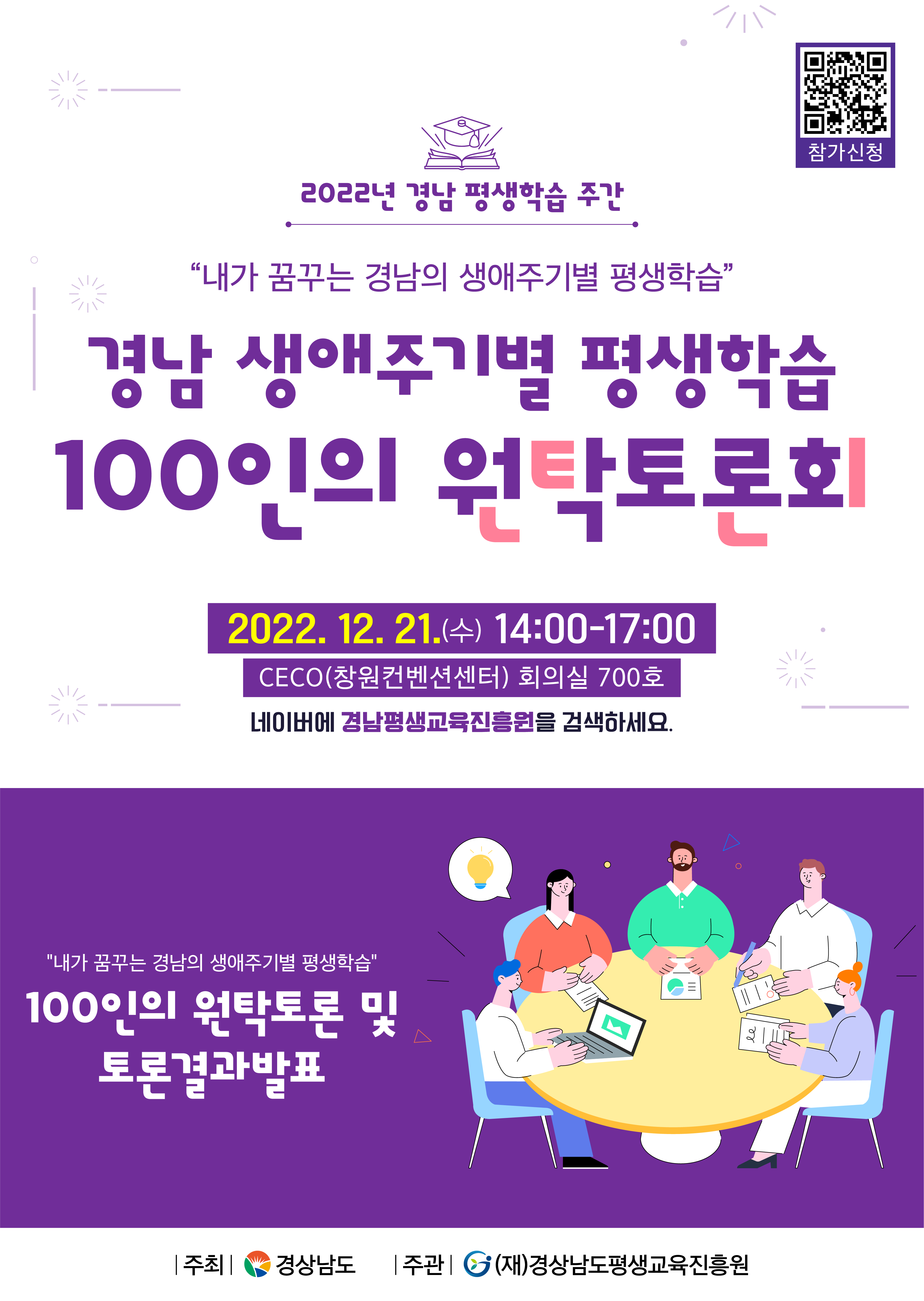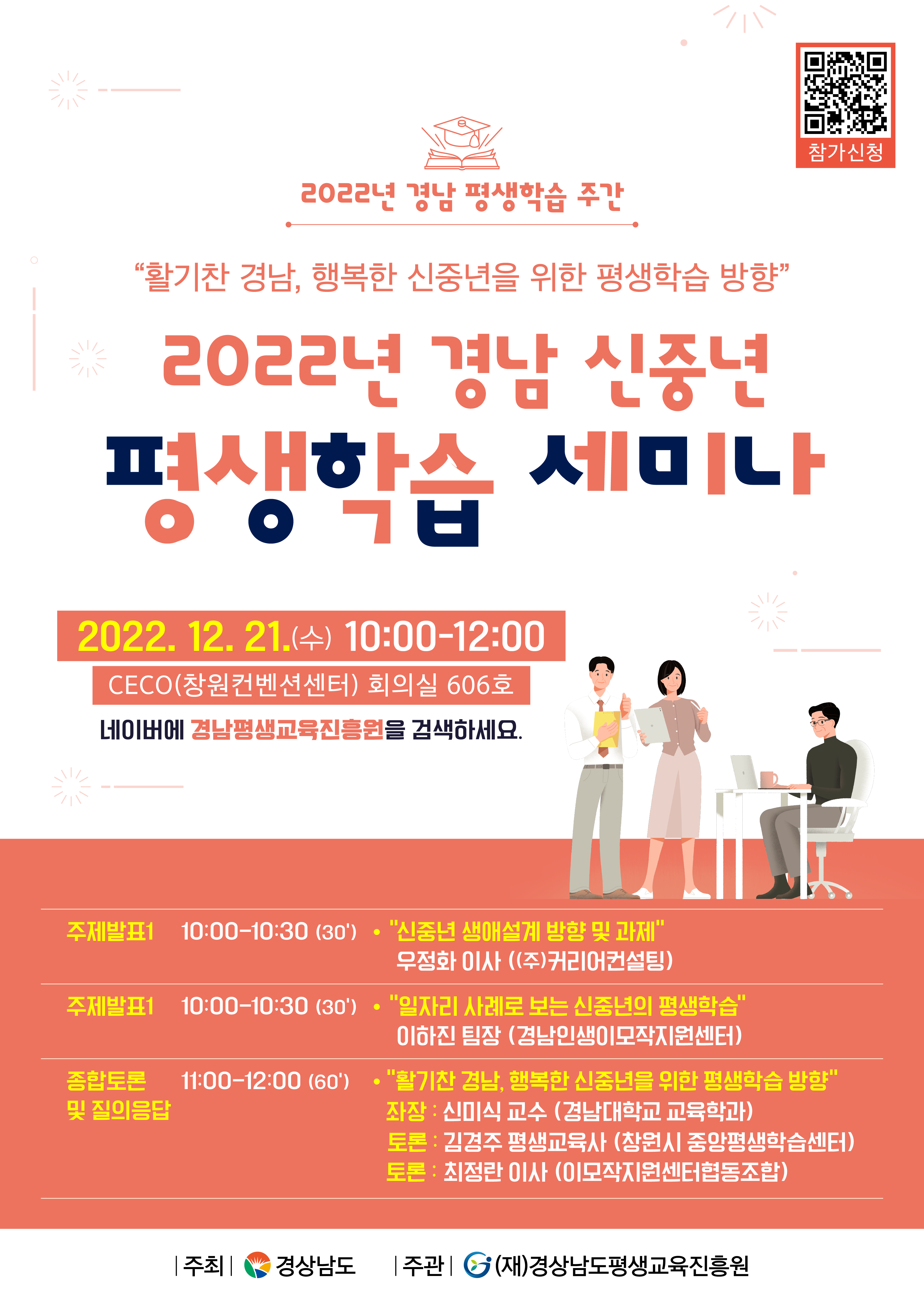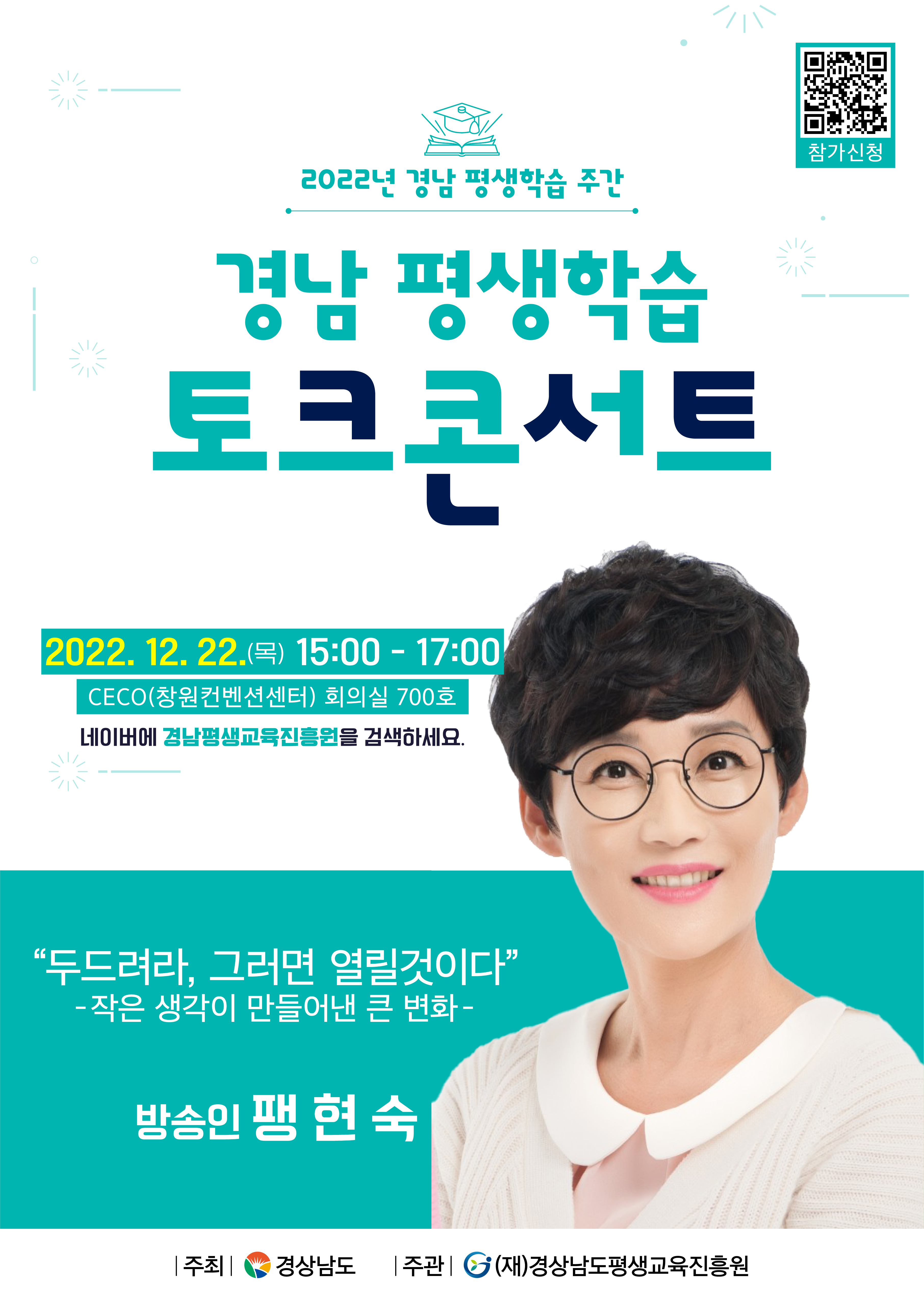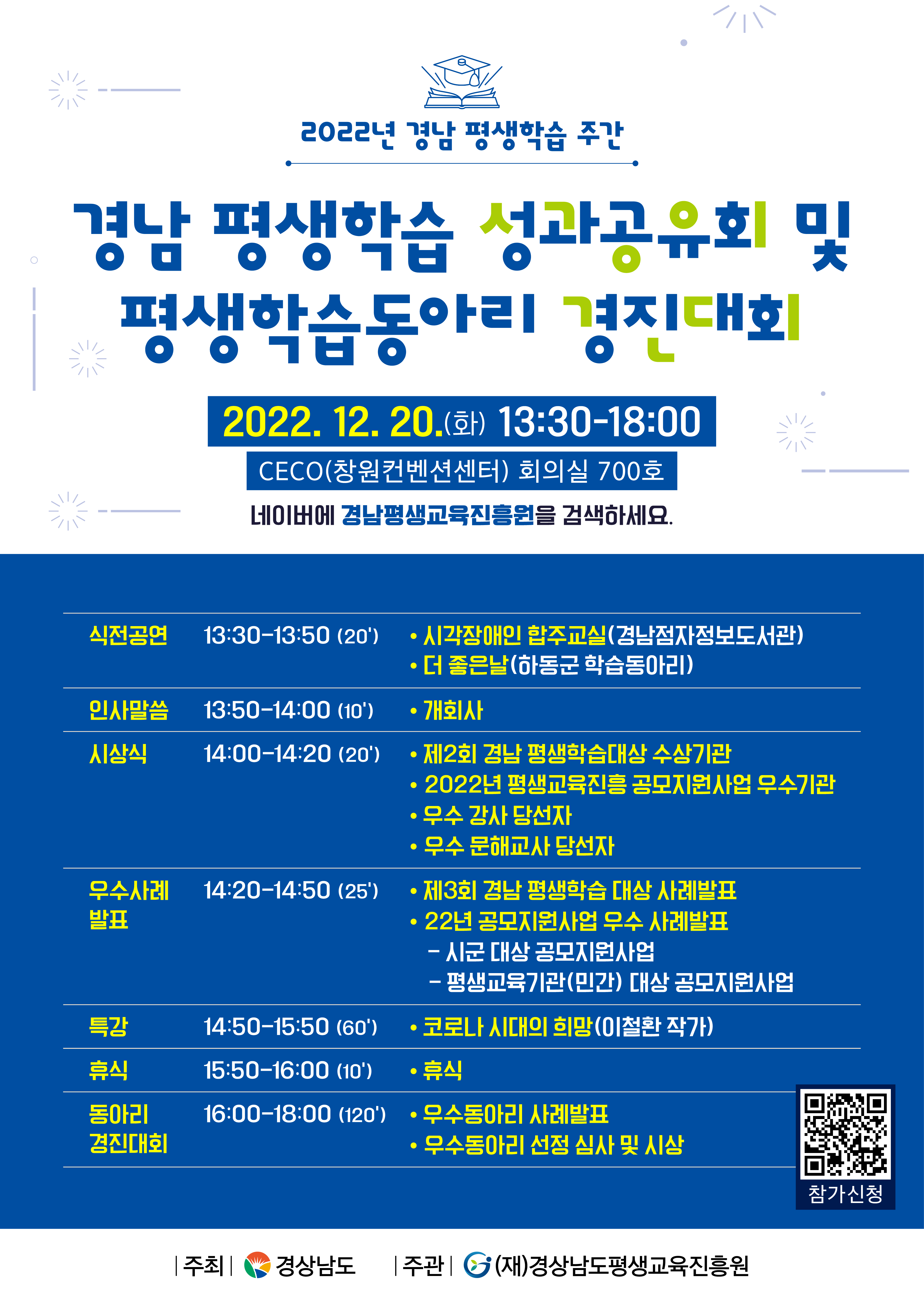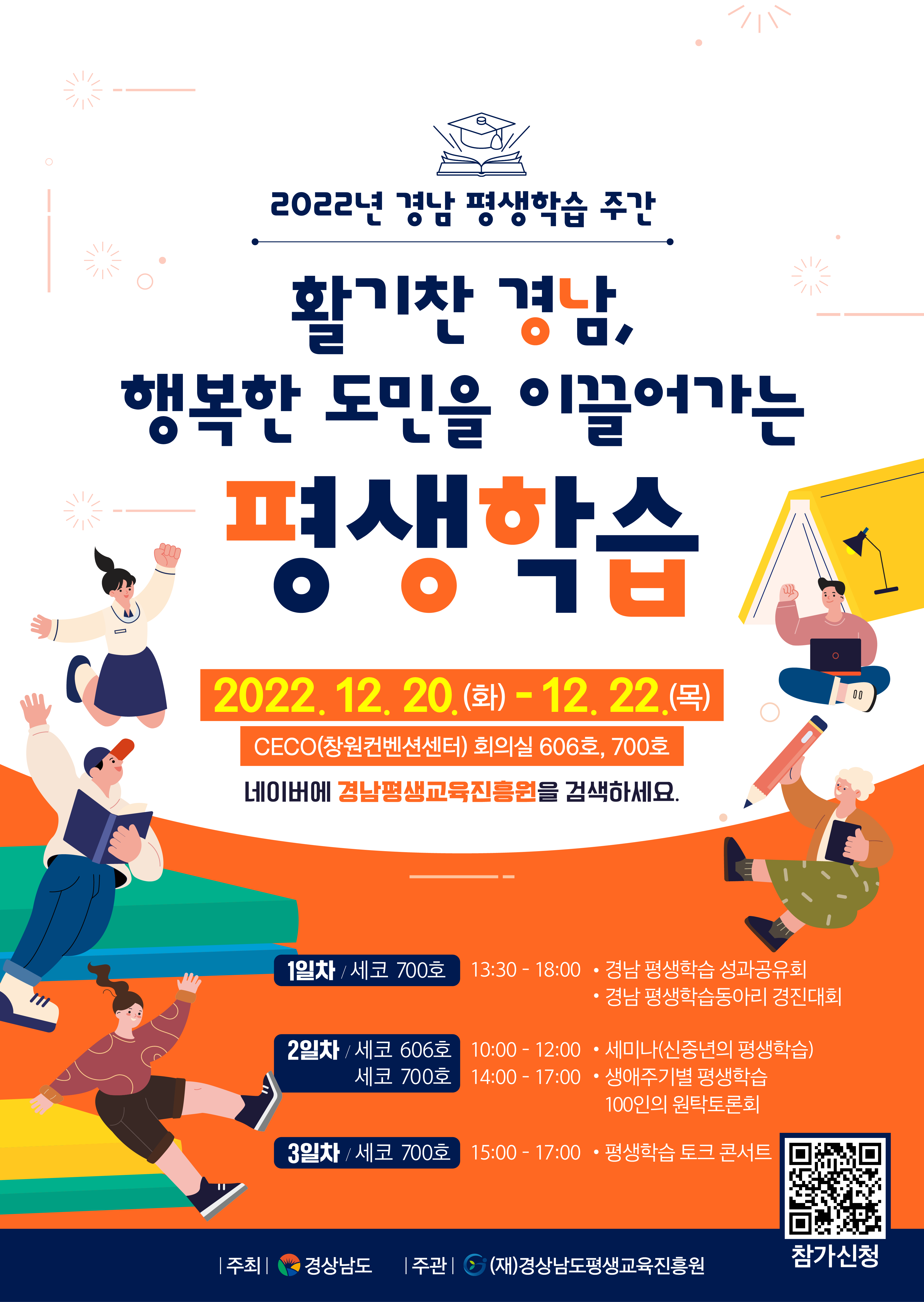 (재)경상남도평생교육진흥원은 도민들이 평생학습을 통해 행복할 수 있도록 "활기찬 경남, 행복한 도민을 이끌어가는 평생학습"이라는 주제로 도민 누구나 참여할 수 있는 「2022년 경남 평생학습 주간」 행사를 개최하게 되었습니다.
