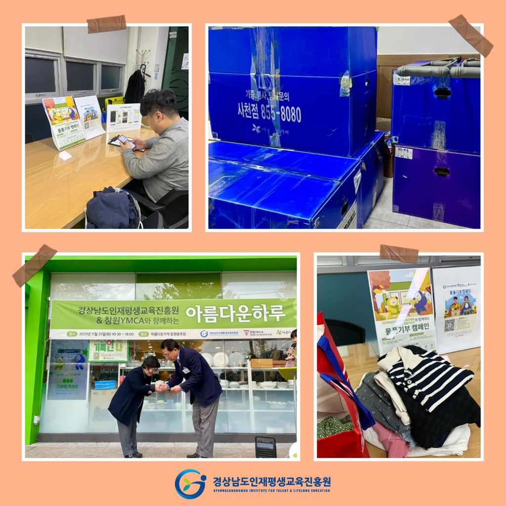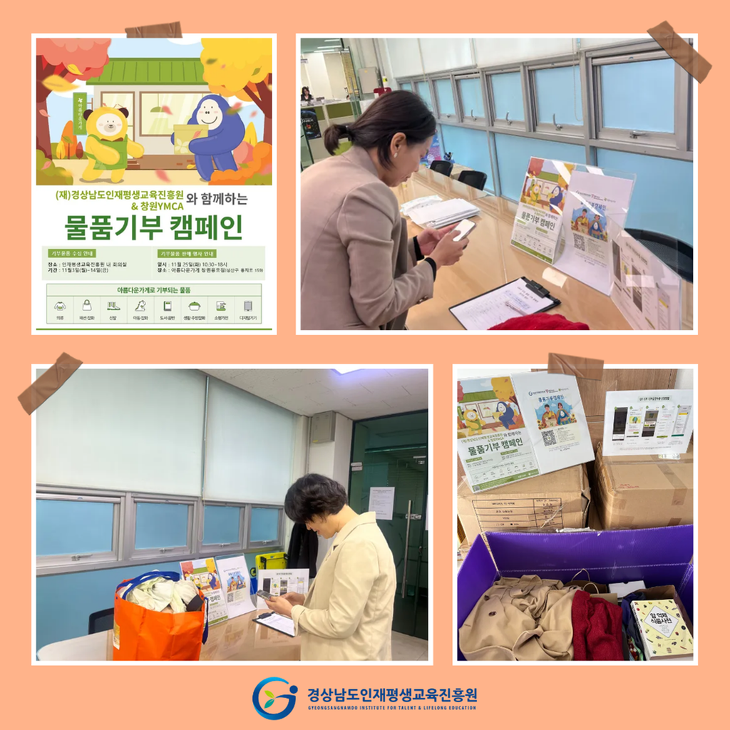 경남인재평생교육진흥원(원장 황태수)은 아름다운가게 창원용호점, 창원YMCA와 함께 ‘나눔과 상생, 물품 기부 캠페인’을 11월 3일부터 14일까지 진행하고, 11월 25일 기부물품 판매 행사를 성공적으로 개최했다. 이번 캠페인을 통해 모인 기부 물품은 총 400여 점에 달한다.