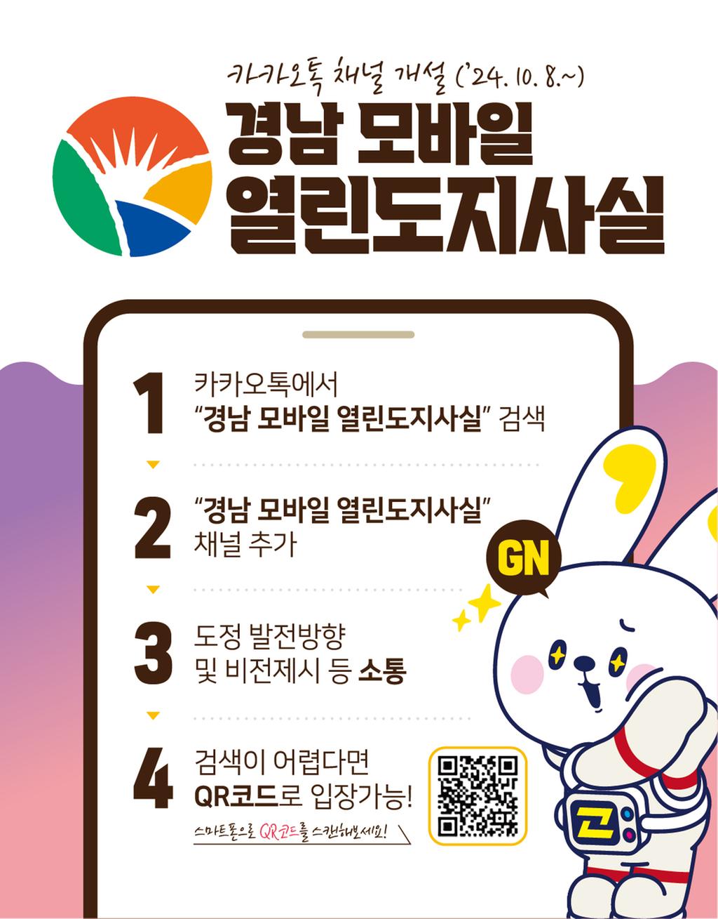 10/8부터 시행하는 경상남도 공식 카카오톡 채널 '경남 모바일 열린도지사실' 개설 운영 하오니 많은 관심 부탁드립니다.